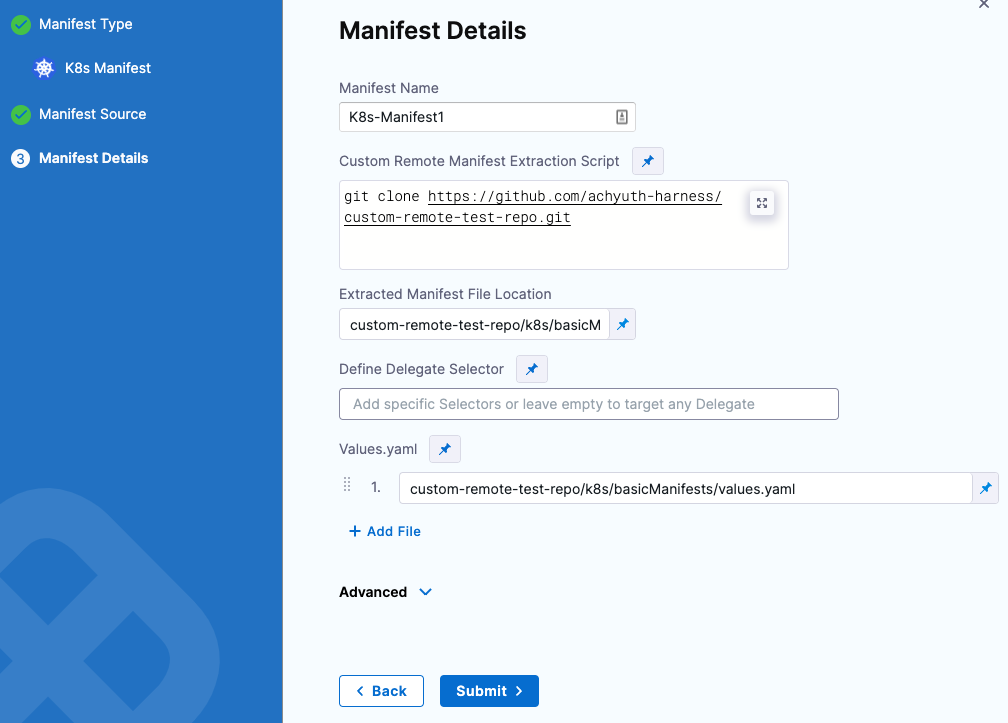 In Custom Remote Manifest Extraction Script, enter the path to the Git repo where your remote manifest script is available. This script runs on the Harness Delegate selected for the deployment.