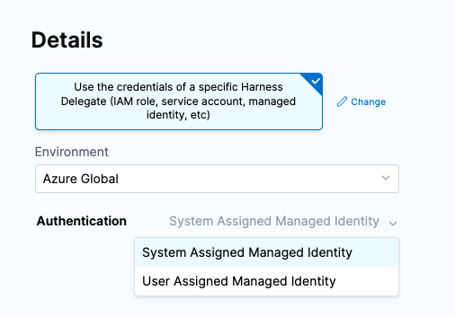The System Assigned Managed Identity and User Assigned Managed Identity options are available when you select the Use the credentials of a specific Harness Delegate option in the Azure connector.