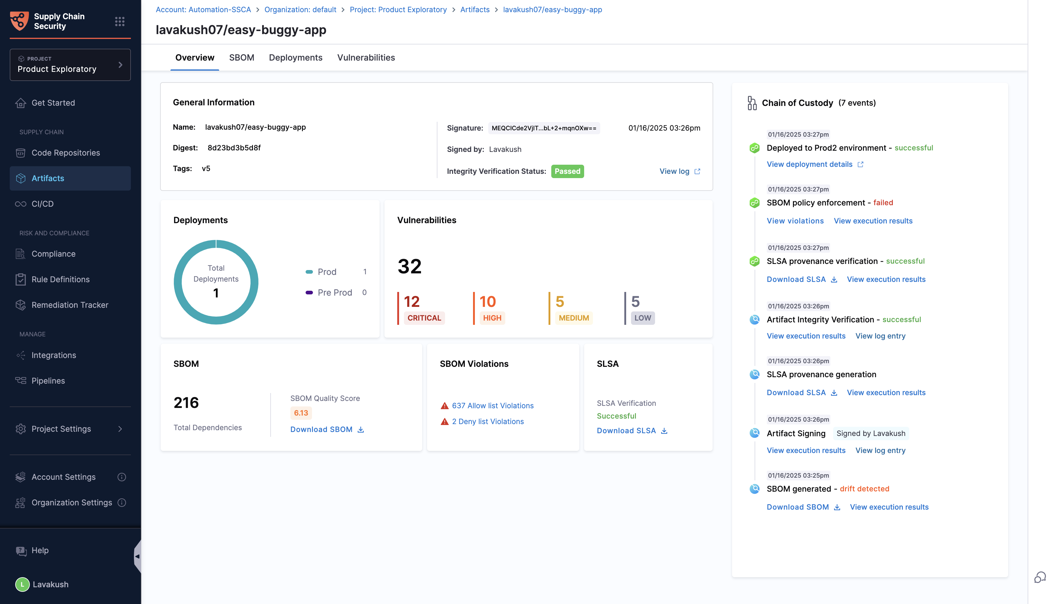 - SLSA Provenance: View the provenance and verification status of artifacts following the SLSA framework.
